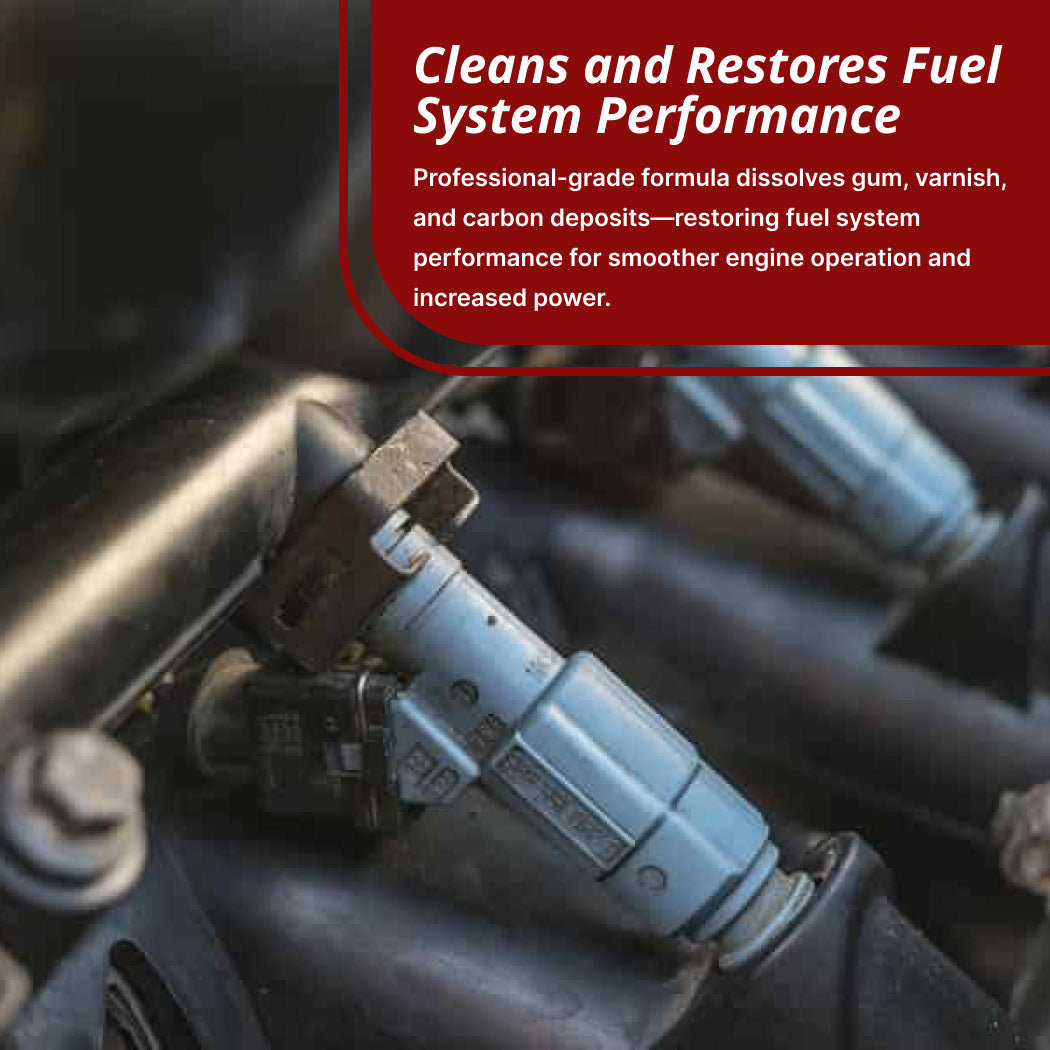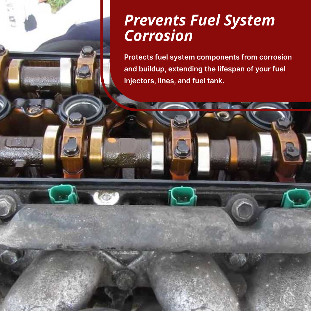 - Dissolves gum, varnish, and prevents fuel system corrosion
