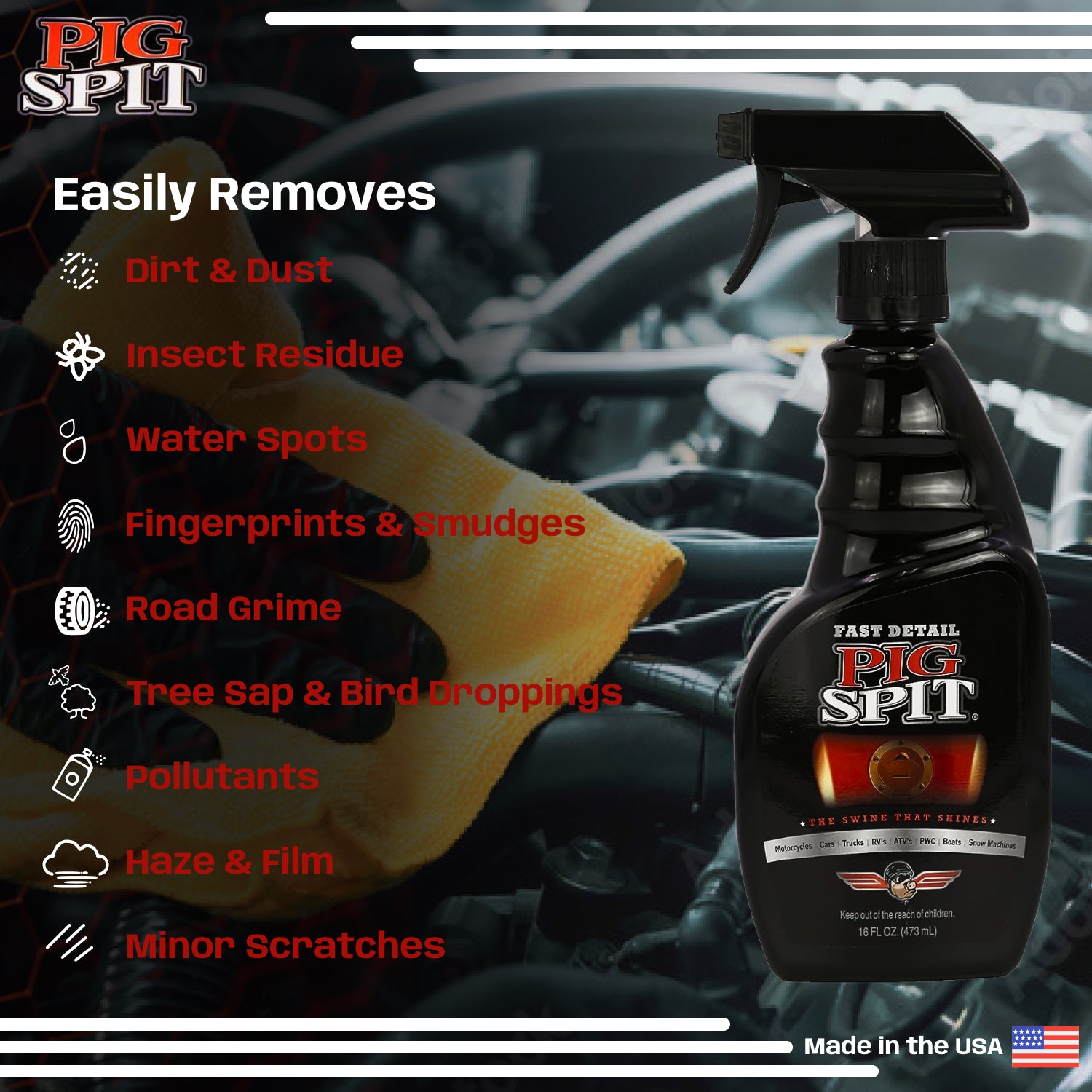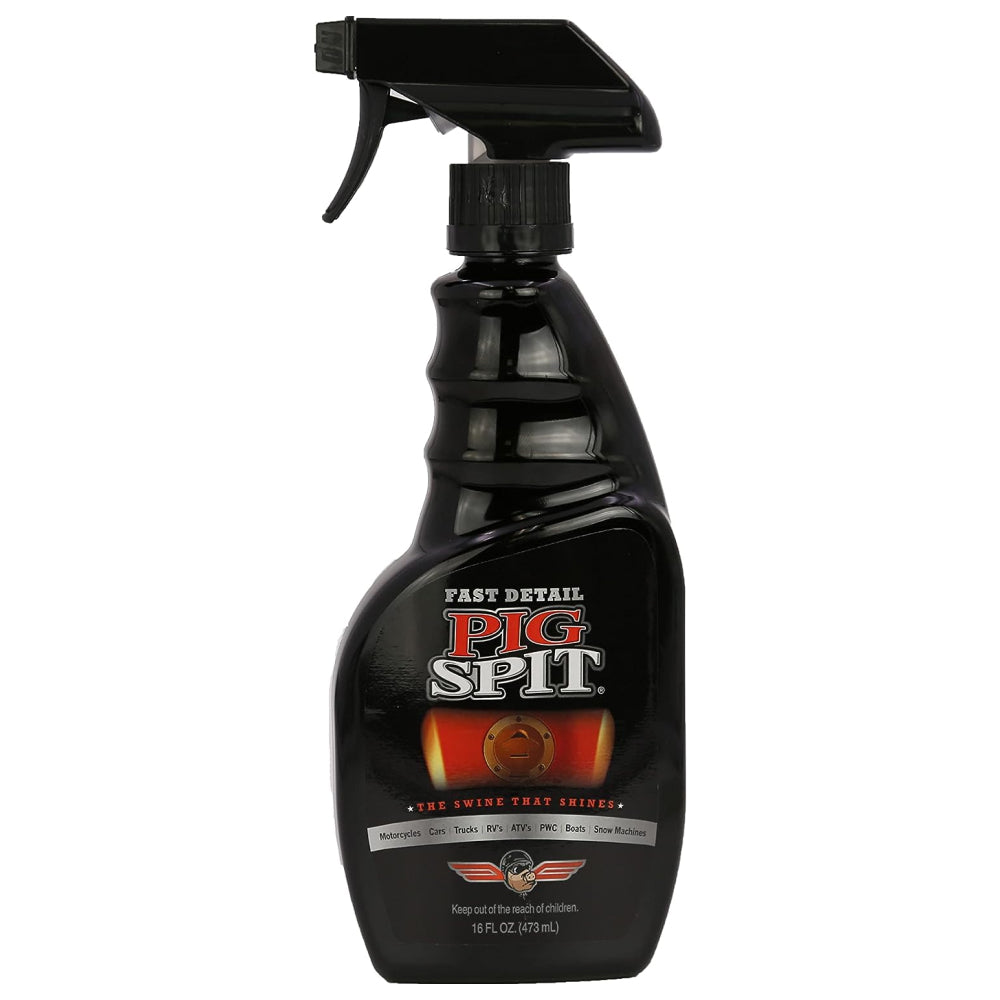 PIG SPIT® Fast Detail is the ultimate quick clean solution for vehicle owners who want fast, professional results. Designed to deliver instant shine with minimal effort, it removes light dirt, dust, fingerprints, and smudges from metal, chrome, plastic, and painted surfaces while leaving a brilliant, polished finish. The easy spray-on formula makes it simple—just apply, wipe, and buff with a microfiber cloth to restore a clean, glossy look in seconds. In addition to enhancing shine, PIG SPIT® Fast Detail adds a light protective layer that helps resist dust, water spots, and minor contaminants, keeping your vehicle looking freshly detailed until its next wash. Perfect for cars, trucks, motorcycles, and more, this versatile formula fits any lifestyle where time and shine both matters.