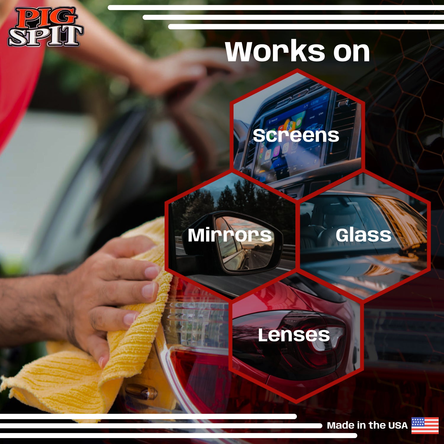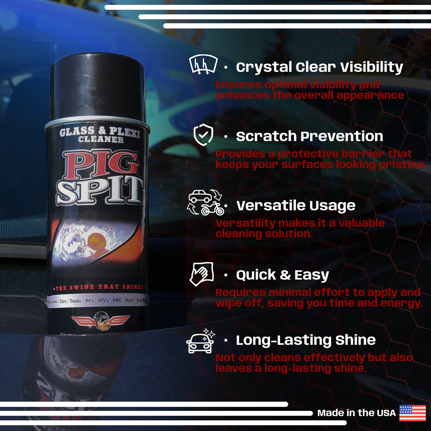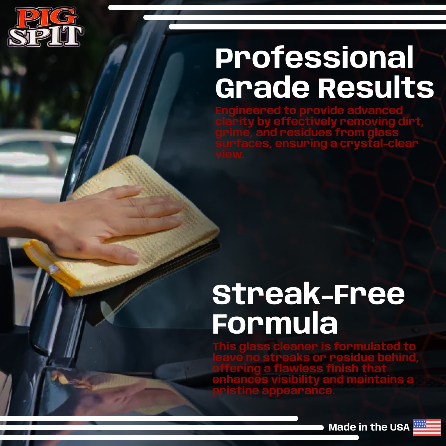PIG SPIT® Glass Cleaner is the go-to solution for crystal-clear automotive glass. Engineered for windows, mirrors, and windshields, it quickly cuts through grime, fingerprints, and tough residue, leaving surfaces spotless and streak-free. The advanced formula ensures maximum clarity without leaving behind any film or haze that could obstruct visibility. Easy to use and safe for all vehicle types, PIG SPIT® Glass Cleaner delivers professional-grade results with a simple spray-and-wipe application. Whether for routine cleaning or detailed prep, it’s the trusted choice for drivers who value a clear, unobstructed view of the road.