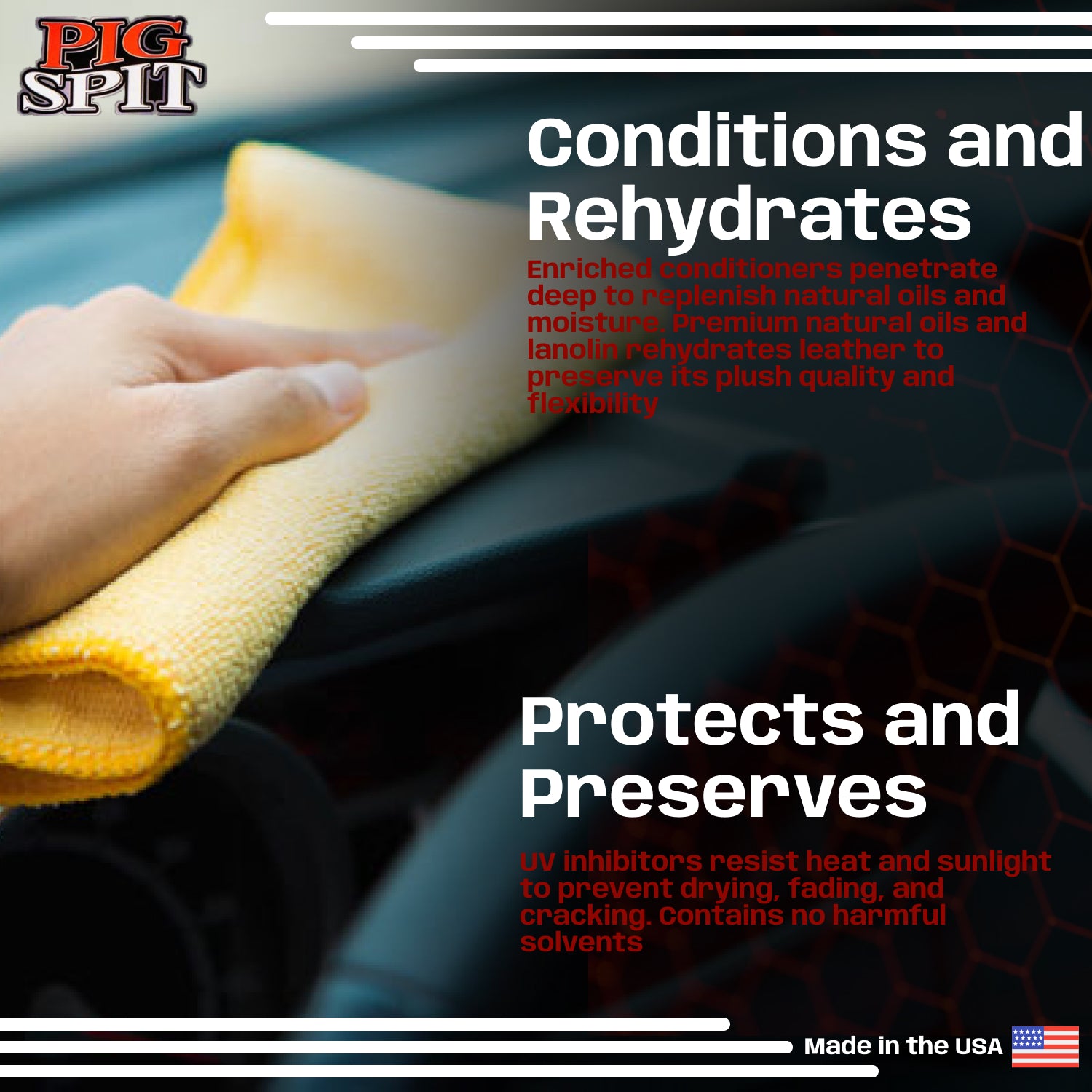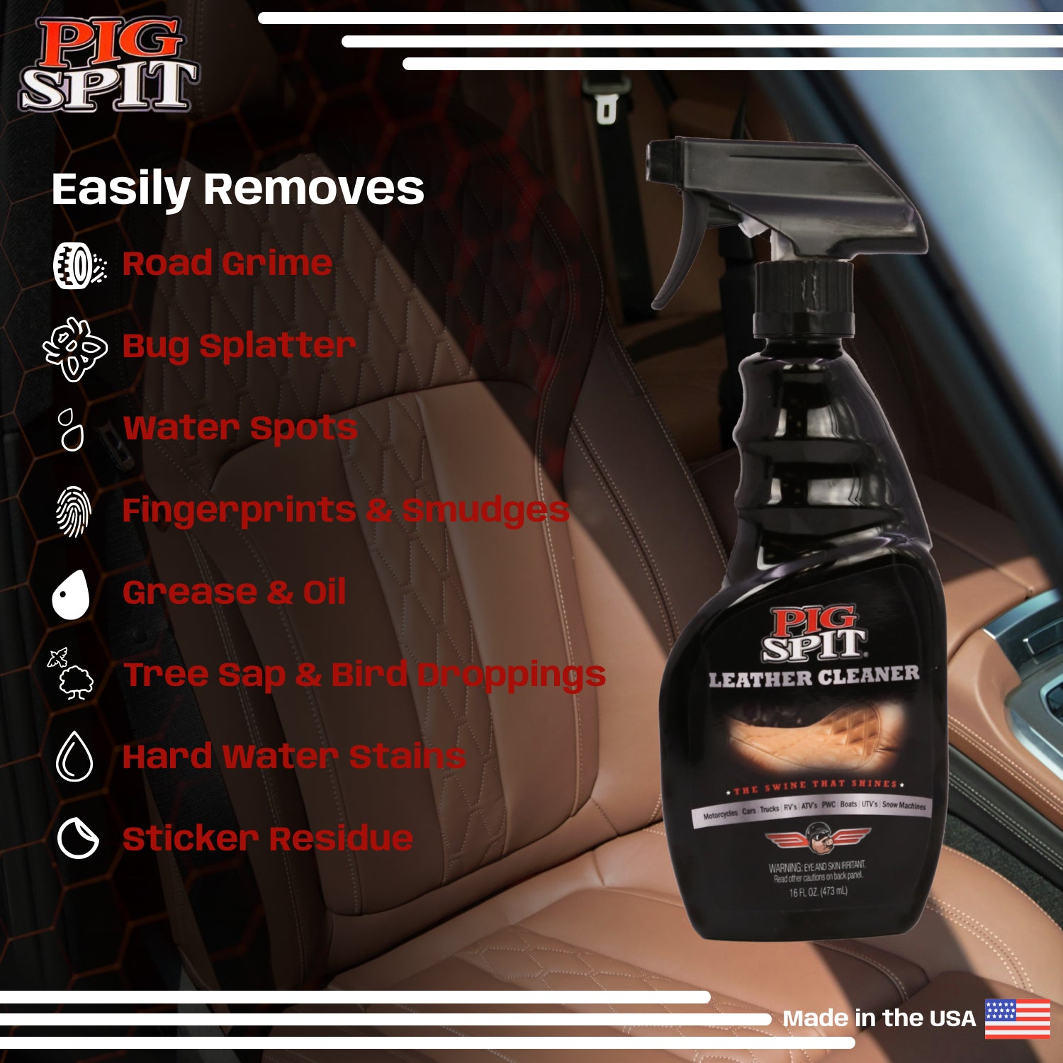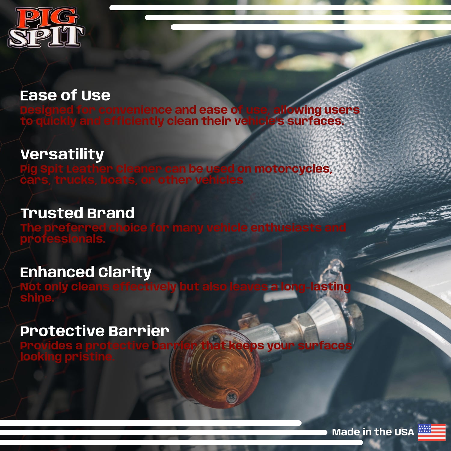 snow machines, and more with Pig Spit Leather Cleaner. Specially formulated to deeply clean and condition leather, Pig Spit offers a comprehensive solution to maintaining the beauty and longevity of your leather goods.