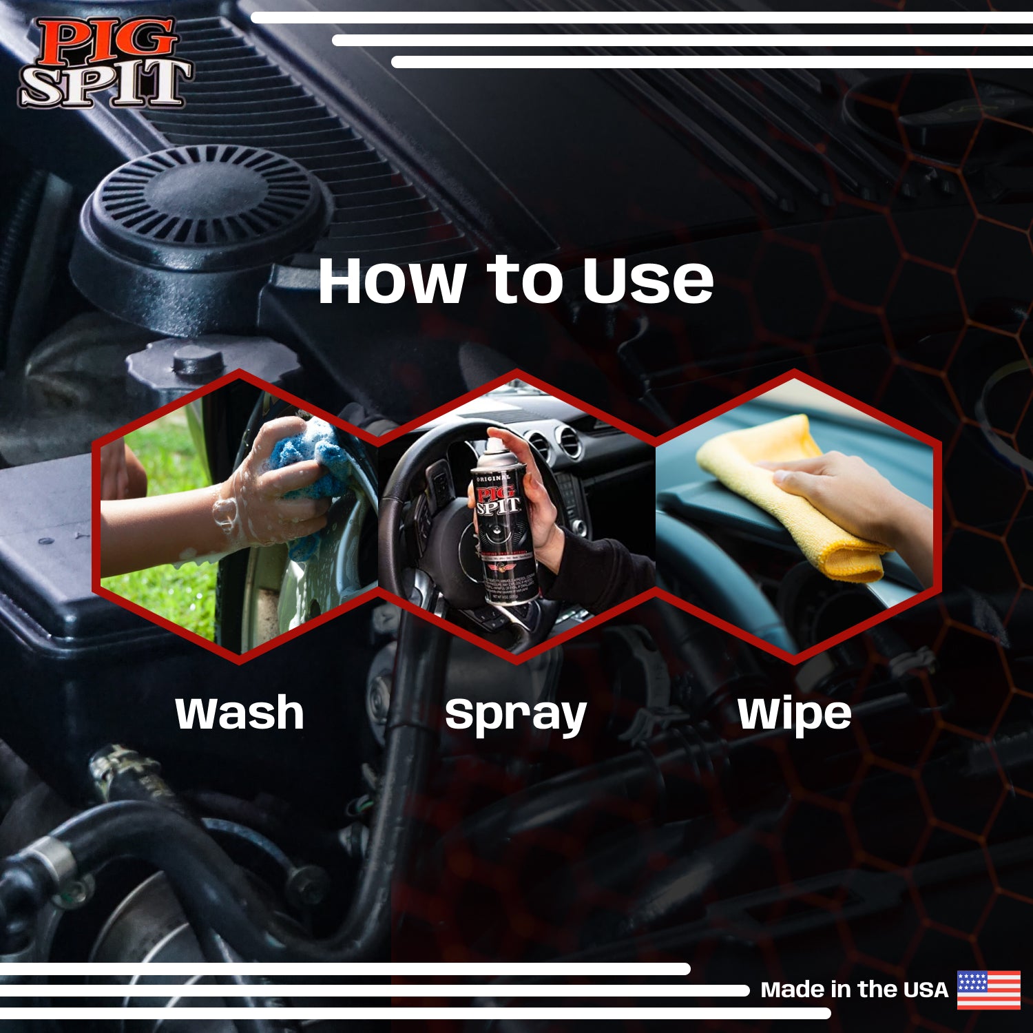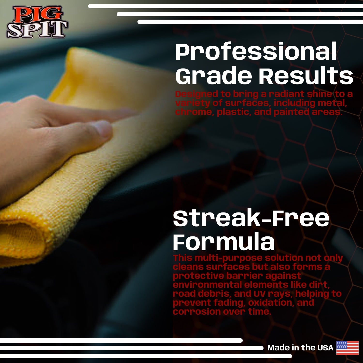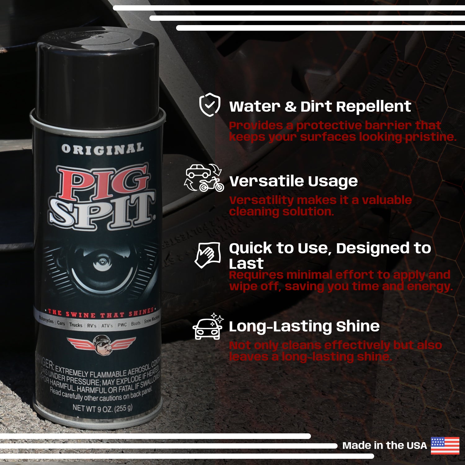 PIG SPIT® Original is a trusted favorite among automotive enthusiasts for its ability to clean, protect, and restore a brilliant shine in one easy step. Formulated for use on metal, chrome, plastic, and painted surfaces, this versatile detailing spray enhances appearance while creating a protective barrier against dirt, road grime, and UV rays. The result is a long-lasting gloss that resists fading, oxidation, and corrosion. With its effortless spray-on application, PIG SPIT® makes it easy to maintain your vehicle’s showroom look—simply spray, wipe, and buff to reveal a dazzling shine. Ideal for motorcycles, cars, trucks, boats, and more, PIG SPIT® Original keeps your ride looking its best, mile after mile.